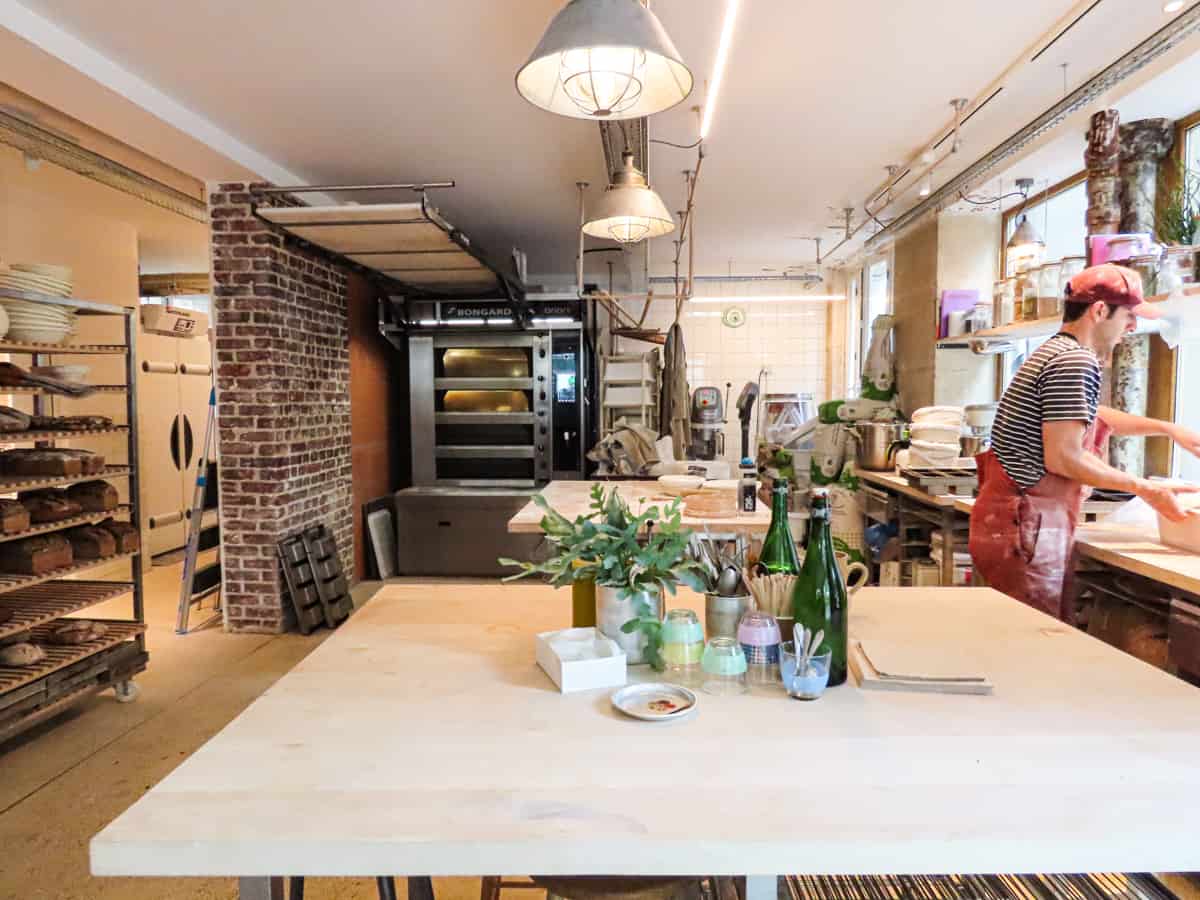 Rue Marcadet, Atelier P1 attire l’oeil avec sa vitrine alléchante, son allure rustique, sol en béton, mur en briques et pierres de taille, et son fournil ouvert sur l’espace de vente. Atelier P1 est une boulangerie, un café, une petite épicerie et un espace accueillant des ateliers autour du pain pour les particuliers.