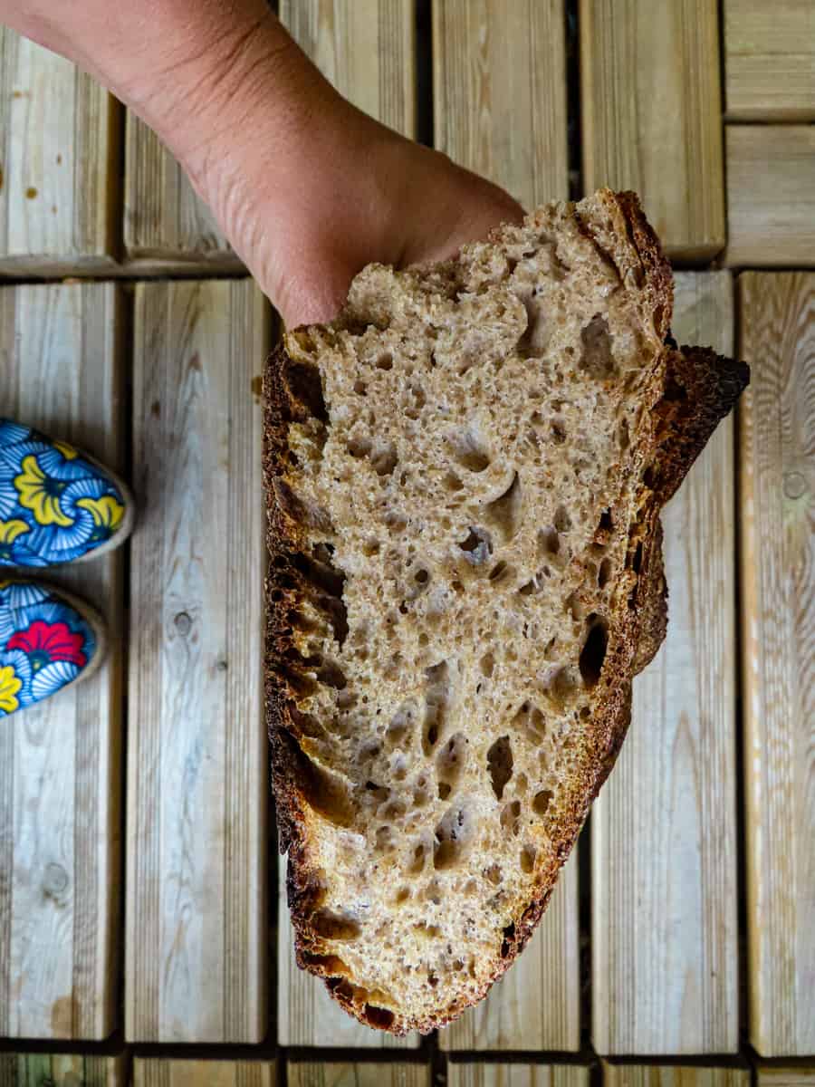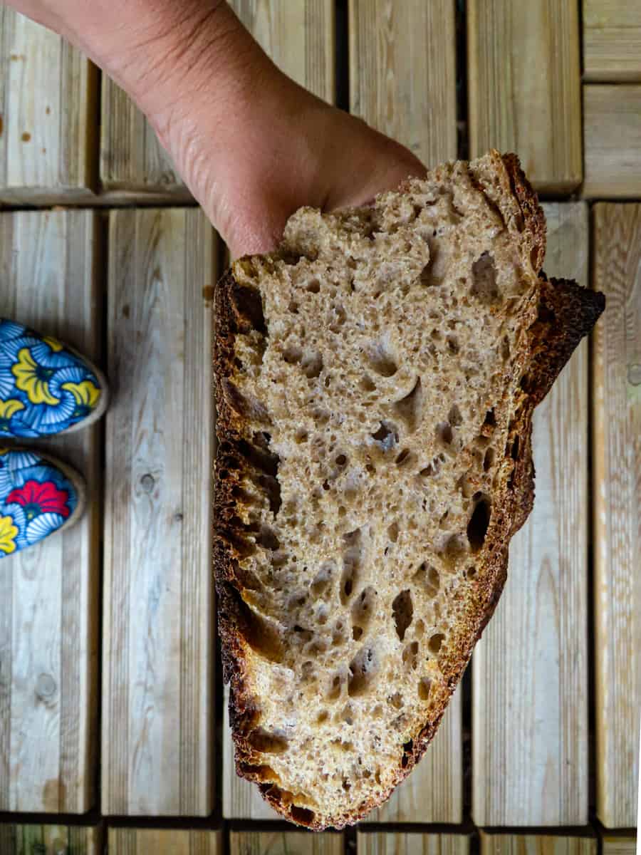 Une grande table d’hôtes et deux petites tables permettent de petit-déjeuner, déjeuner ou goûter face au fournil. Tartelettes salées (tomates Datterino, olives Kalamata, pistou basilic huile d’olive et ail et romarin frais), sandwichs au pain bio (ex. : champignons de Paris au miso, poulet mariné au citron, carottes, caviar d’artichaut).