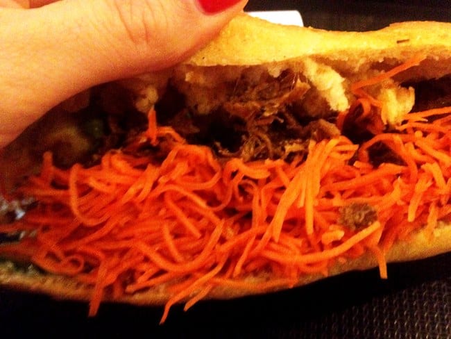Pour moi, c’est un bánh mì boeuf cacahuète avec un peu de sauce piquante, crudités et la sauce maison (citronnée) et de généreuses feuilles de coriandre. J’ai adoré, cacahuète, coriandre, de la bonne baguette, des superbes saveurs dans une baguette fraîche du boulanger d’à côté. A tester dans les autres restos préconisés par la reine du bánh mì.