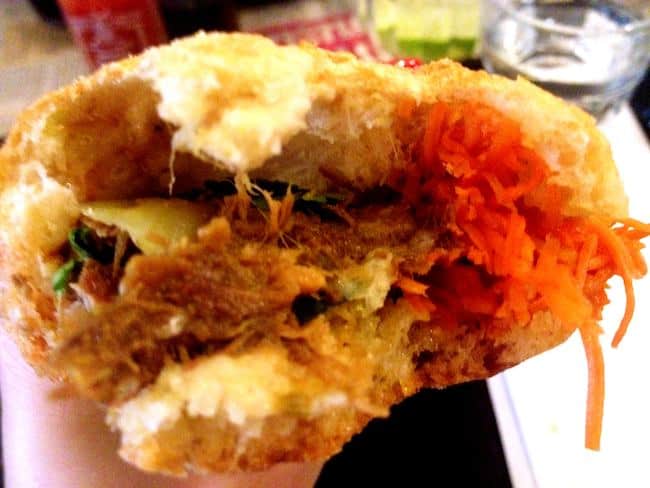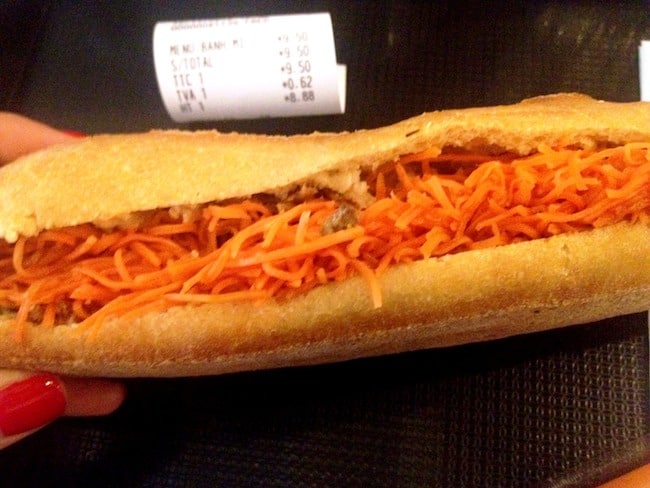 J’ai appris l’origine très amusante du mot Banh mi dans un autre article dédié à ce sandwich : “Déformation phonétique de “pain de mie””. Et pourtant, ce sandwich n’est pas à base de pain de mie mais de baguette…