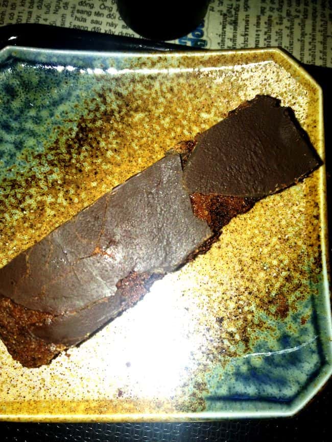J’ai pris le gâteau au chocolat dont la recette inclus de la courgette (si, si, amateur d’Un dîner presque Parfait, vous le savez, c’est pour l’onctuosité) et des épices. Un goût prononcé entre moelleux au chocolat et pain d’épices. Anaïs La Brune a choisi une panna cotta au lait de coco et coulis de Litchi Framboise. Elle a un peu regretté son choix pour mon excellent spicy chocolate cake.