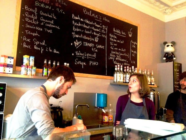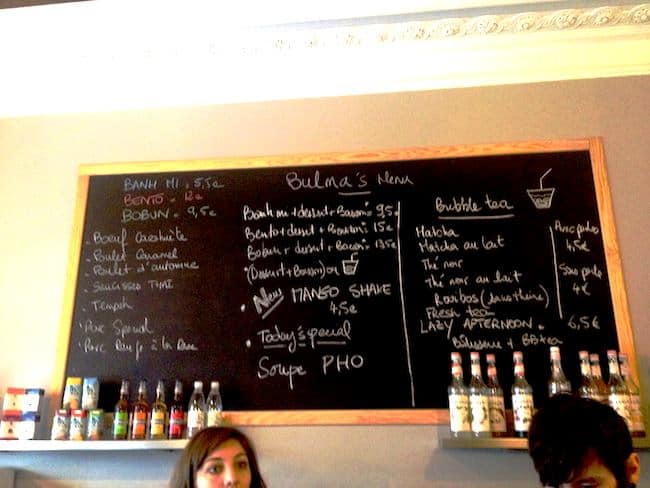 Au 17 rue des petites Ecuries, Bulma affiche la couleur sur sa devanture : “Créateur de sandwich asiatiques etc…”. Oui etc… tient ici toute son importance. Jeudi 8 novembre, je pousse pour la première fois la porte de Bulma, il est encore tôt et Anaïs la brune est déjà là. Nous arrivons sans idée précise de ce que nous désirons manger mais pour la boisson, notre choix est fait… Bubble Tea ! La bulle fit FLOP quand la serveuse nous lance “plus de perles aujourd’hui”. Pas de souci, au contraire, une bonne raison pour revenir… Lundi 12 novembre, le retour… pour essayer tout ce qu’il me manquait pour juger du lieu…