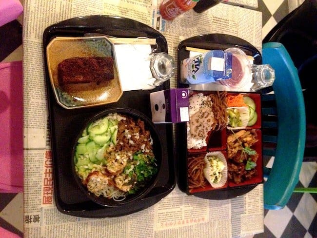 Déjà grande aficionada des bentos, ce resto m’a définitivement rendu accro à ses petites boites qui mêlent l’enfance à la gourmandise. Déçue au début par l’avarie de bubble tea, mon bento plein de couleurs et de saveurs m’a vite fait oublier ma déception. Comme l’a dit La Blonde, il manquait à mon dessert ce petit goût de “reviens-y” mais mon bento m’a vraiment comblée 😛 et même surprise par certaines bouchées. Pour le coup je n’en ai pas laissé un grain de riz ni une miette de tofu mariné. Le bánh mì de La Blonde me tente quand même pas mal même si la description baguette/viande me rappelle un peu les grecs de quartier… Next time!