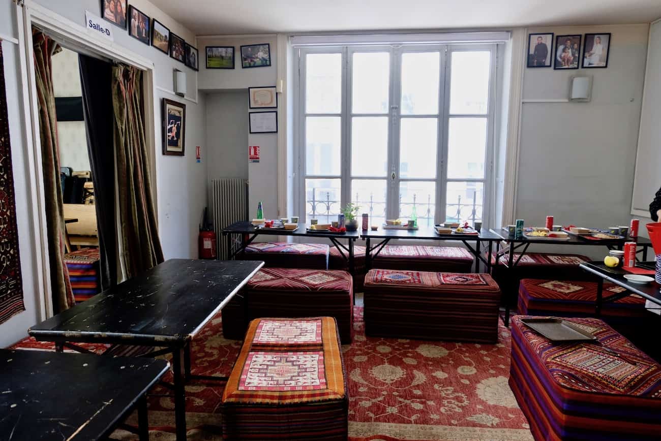 Il y a des adresses qui ne font pas que nourrir l’estomac. Il y a des adresses qui donnent le smile, qui redonnent foi en l’humanité. Il y a des lieux où l’on se dit que tout est possible. Et qu’ensemble, c’est mieux. Alors, oui, c’est bon. C’est très bon, généreux, ça sent le fait maison, le voyage, la cuisine familiale, et c’est très peu cher, encore moins si l’on considère le quartier. Mais c’est surtout un lieu un peu fou où un papi du 7ème déjeunait sur la table d’à côté, où les attachés du Ministère se pressent pour déjeuner sur les bancs inconfortables de la salle de cours des réfugiés réchauffée de tapis persans. Une vraie feel-good cantine avec une âme. Un lieu éphémère que l’on voudrait là pour toujours.