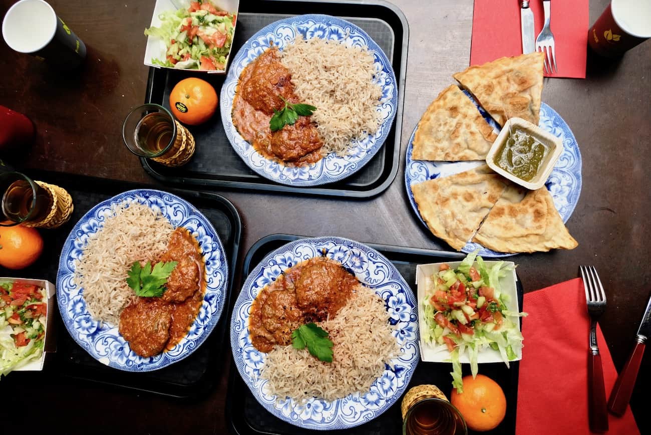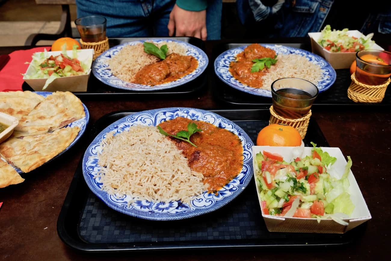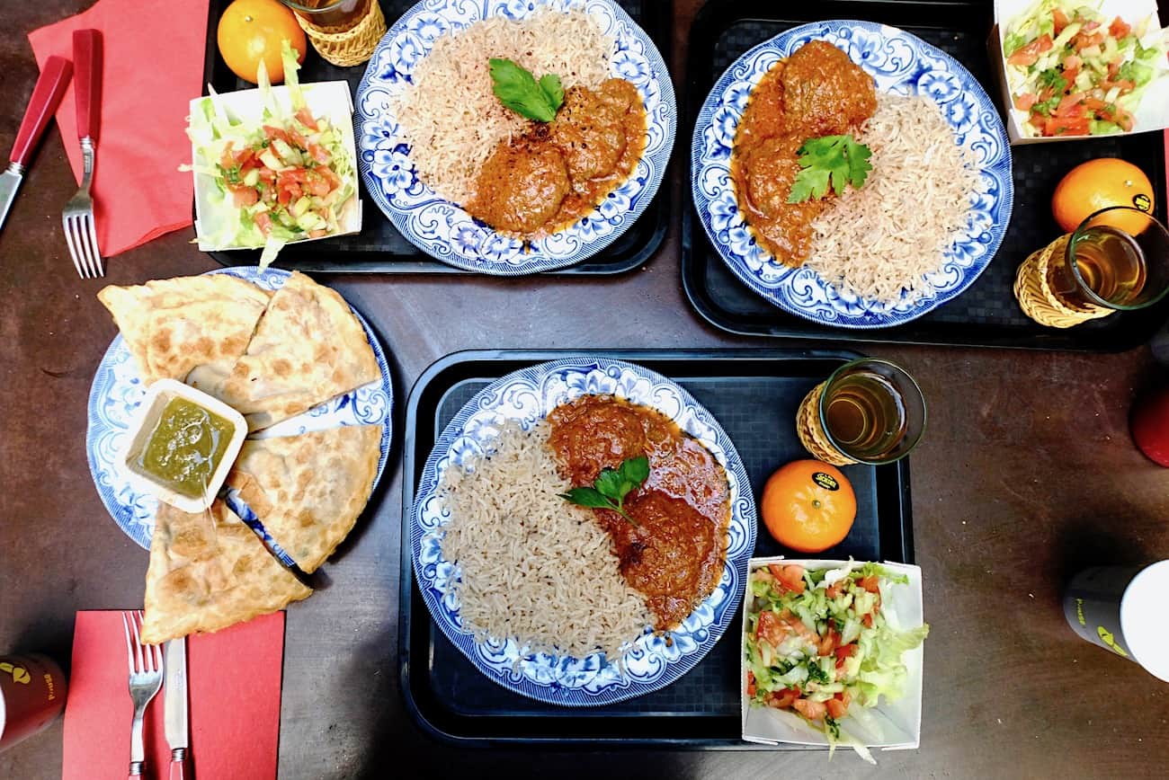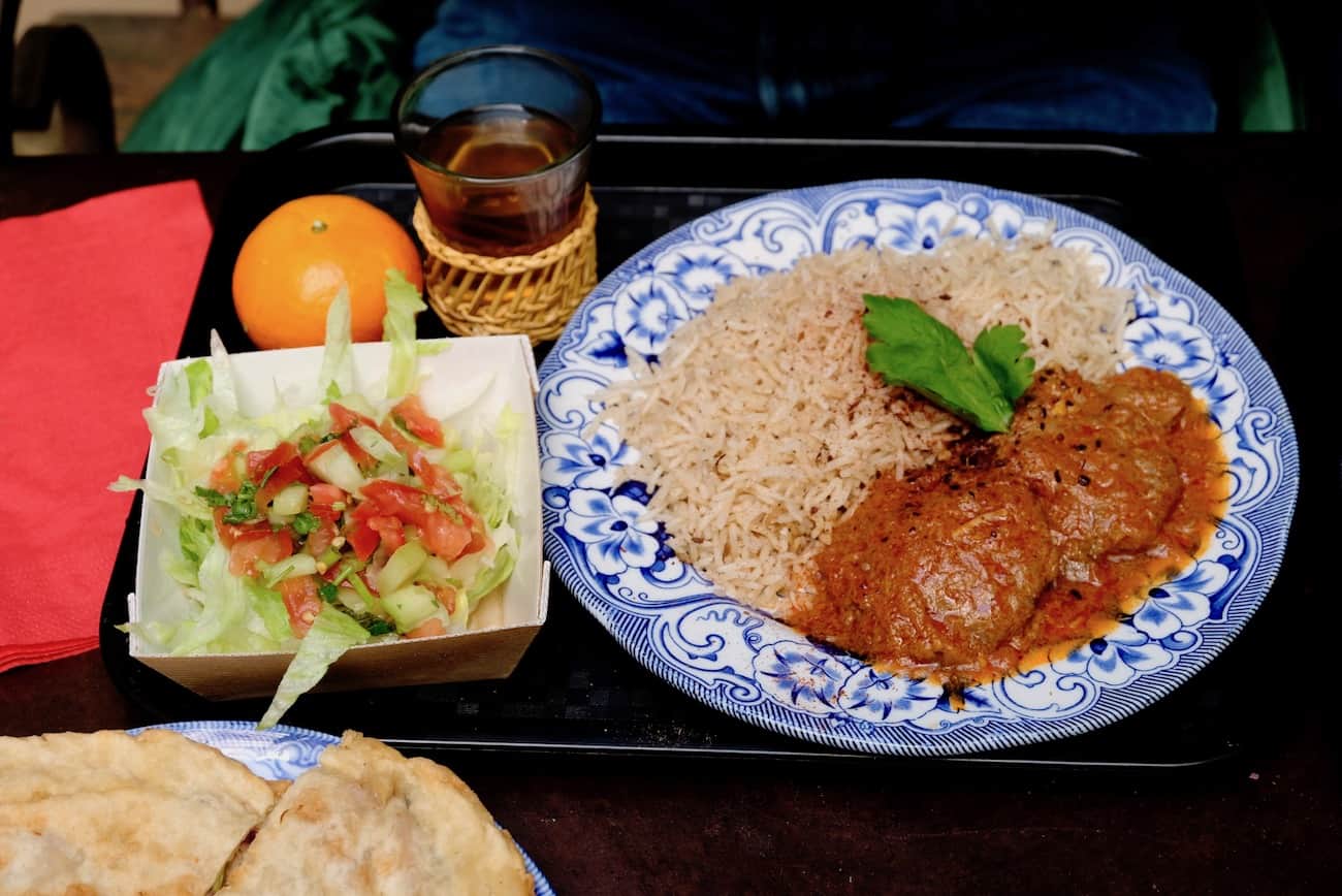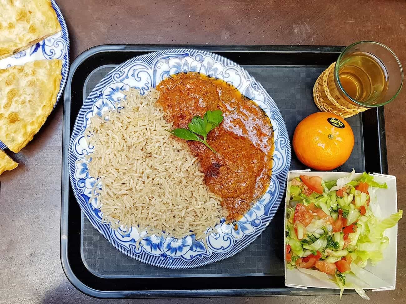 Menu unique qui change tous les jours. Aujourd’hui, sur notre plateau, aux côtés de la salade de concombre-tomate, simple mais pleine de peps, on trouve une assiette généreusement garnie de riz parfumé et de boulettes de viande à la sauce tomate aux épices. Nous avons choisi du thé et une clémentine (le menu inclut un soft ou un thé et un fruit). Nous avons aussi craqué pour une galette aux herbes et pommes de terre.