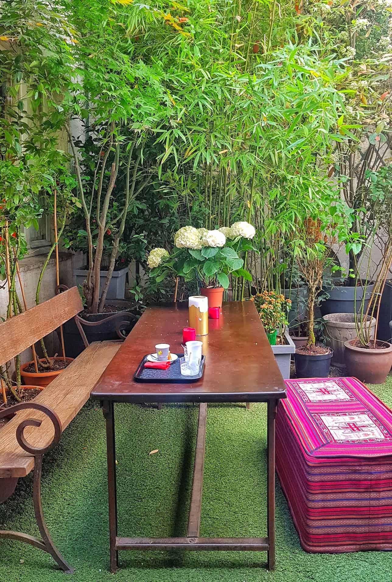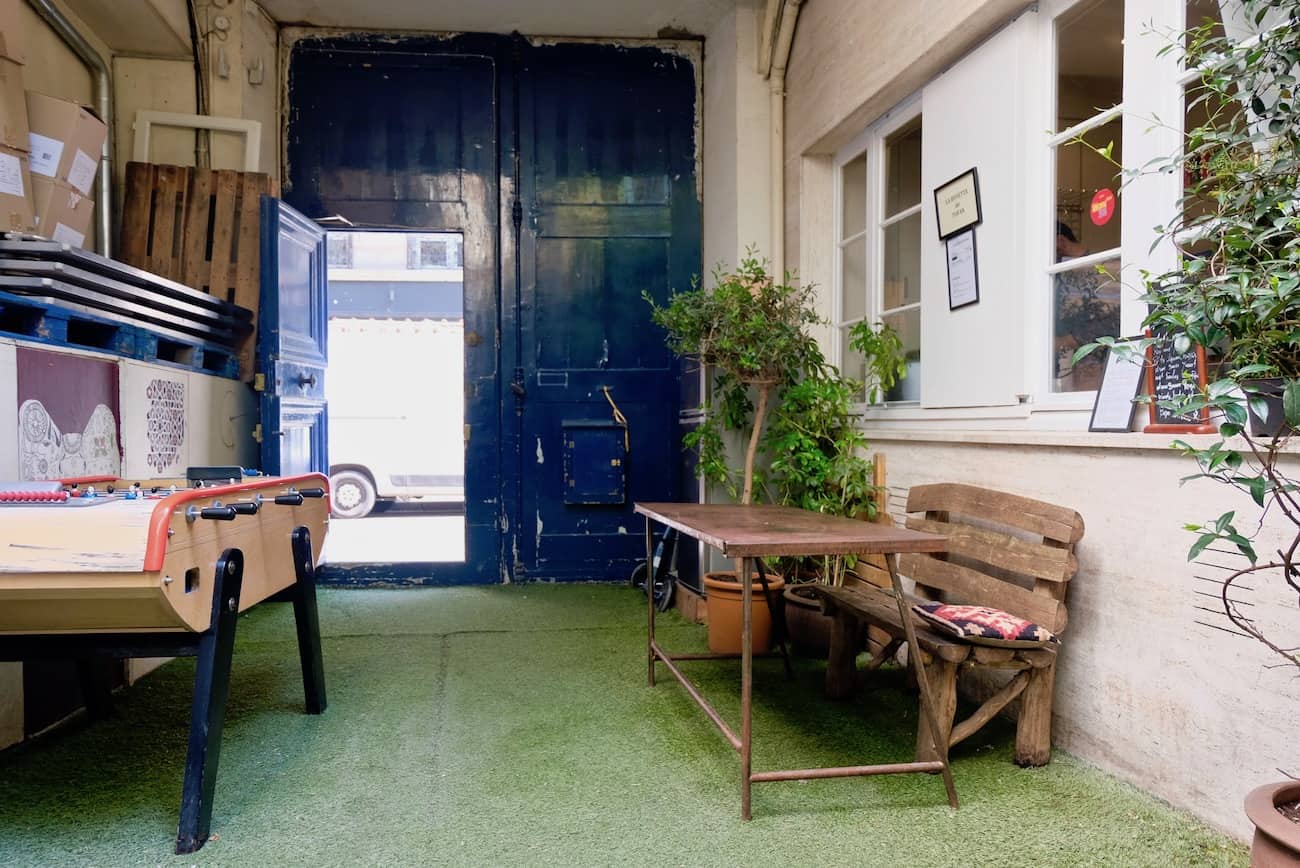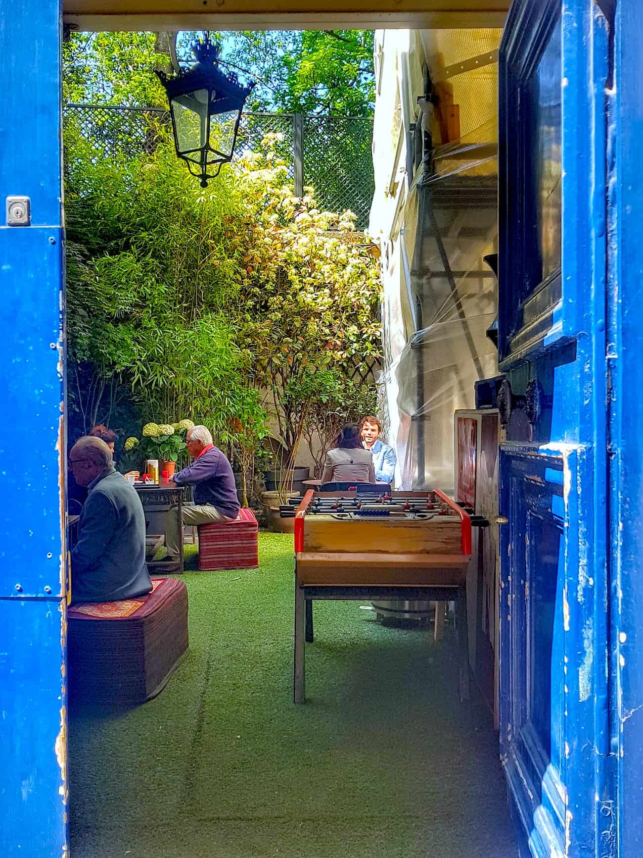 À côté de la grande porte cochère bleue, sur une plaque dorée, sous un âne bleu, on peut lire “Pierre Claver. Aide aux demandeurs d’asile.” C’est au sein de cette association et école pour demandeurs d’Asile que nous nous rendons pour le déjeuner en cette chaude journée. Le menu est indiqué sur la porte entrouverte qui laisse apercevoir une petite terrasse improbable avec en premier plan un baby foot. Les effluves de safran ont rempli le petit jardin. J’entre en passant devant la cuisine. Au premier étage, deux grandes salles de classe aux tapis persans qui laissent place aux cols blancs du 7ème à l’heure du déjeuner et du dîner et une seconde petite terrasse très prisée. Tofan, réfugié afghan, fut l’un des premiers élèves de l’école de l’Association. Elle lui a offert l’opportunité de tester pendant 4 mois son offre de restauration afghane. Assez réservé et à la fois fier, il m’a confié avoir déjà une piste pour un autre lieu dans le quartier.