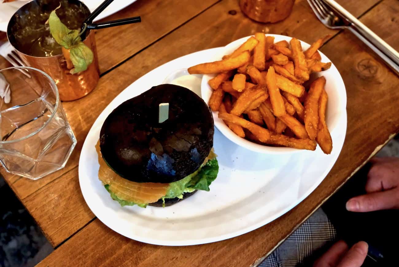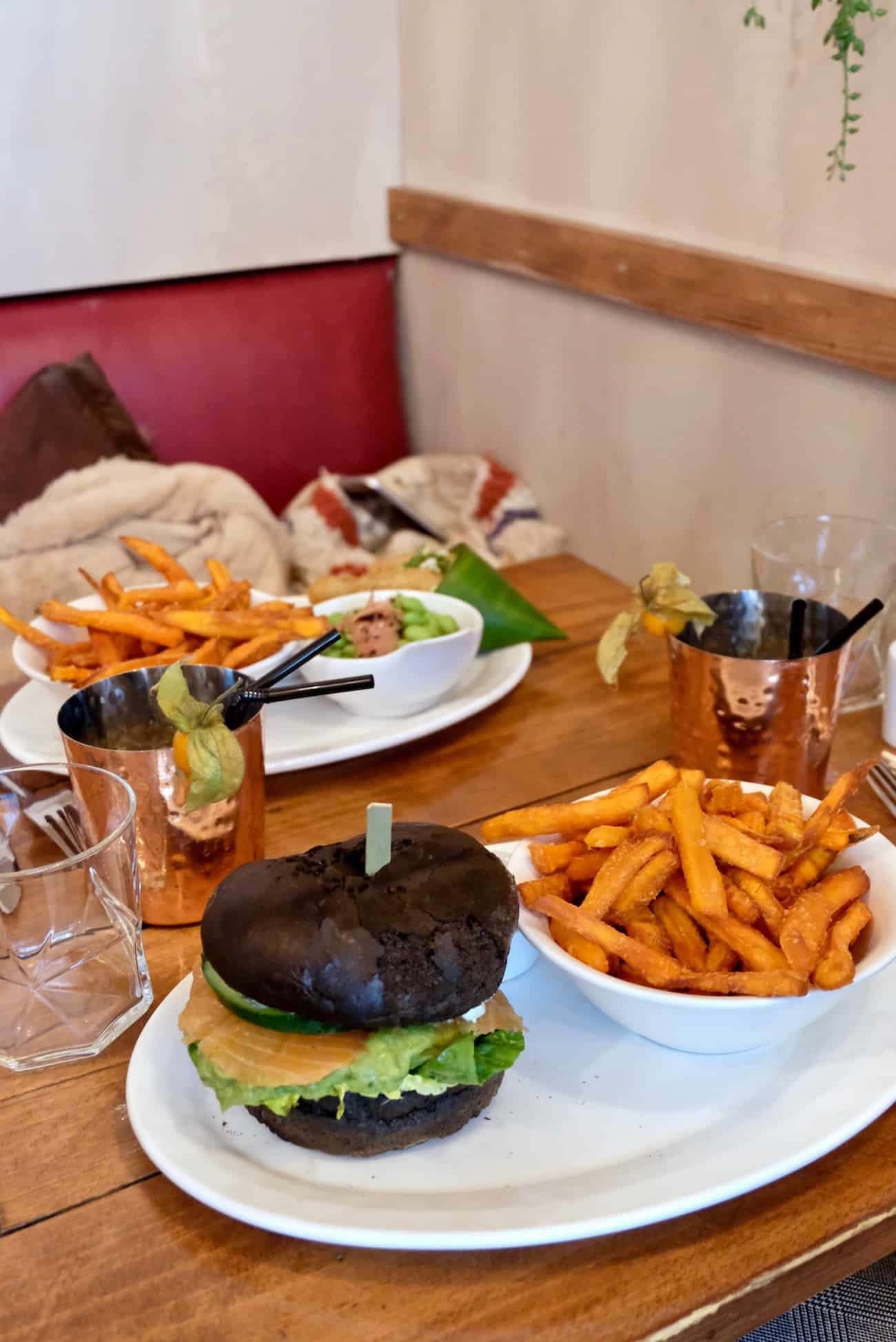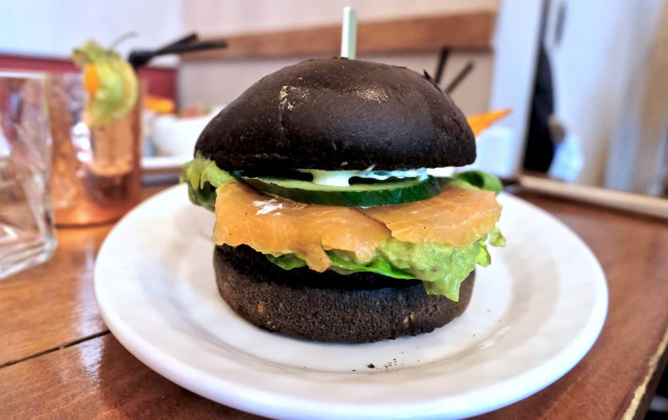 Sashimi burger & patates douces : bun à l’encre de seiche, saumon confit, guacamole, concombre, crème de wasabi.