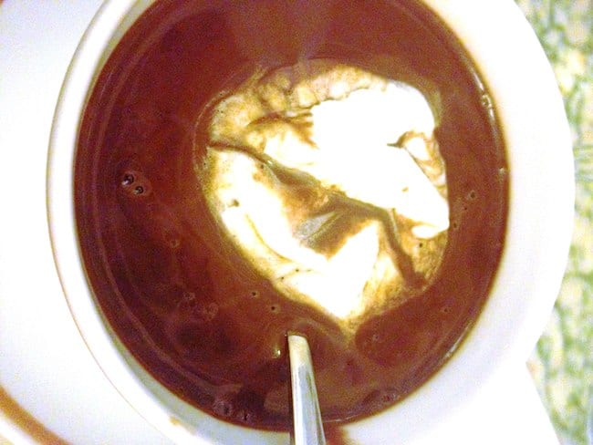 Deux africains, LA spécialité de la maison. Un chocolat chaud à l’ancienne, de ton arrière arrière grand mère en somme. Avec du vrai chocolat et du lait entier. Ce chocolat chaud ne se boit pas, non, il se mange et je le déguste à la petite cuillère, il est accompagné d’une coupelle de délicieuse crème fouettée. J’ai déjà bu des chocolats chauds de grands chocolatiers mais parfois l’amertume poussée du chocolat peut laisser à un palais néophyte un goût amer… Ici, l’Africain propose une saveur authentique mais acceptable pour tout palais.